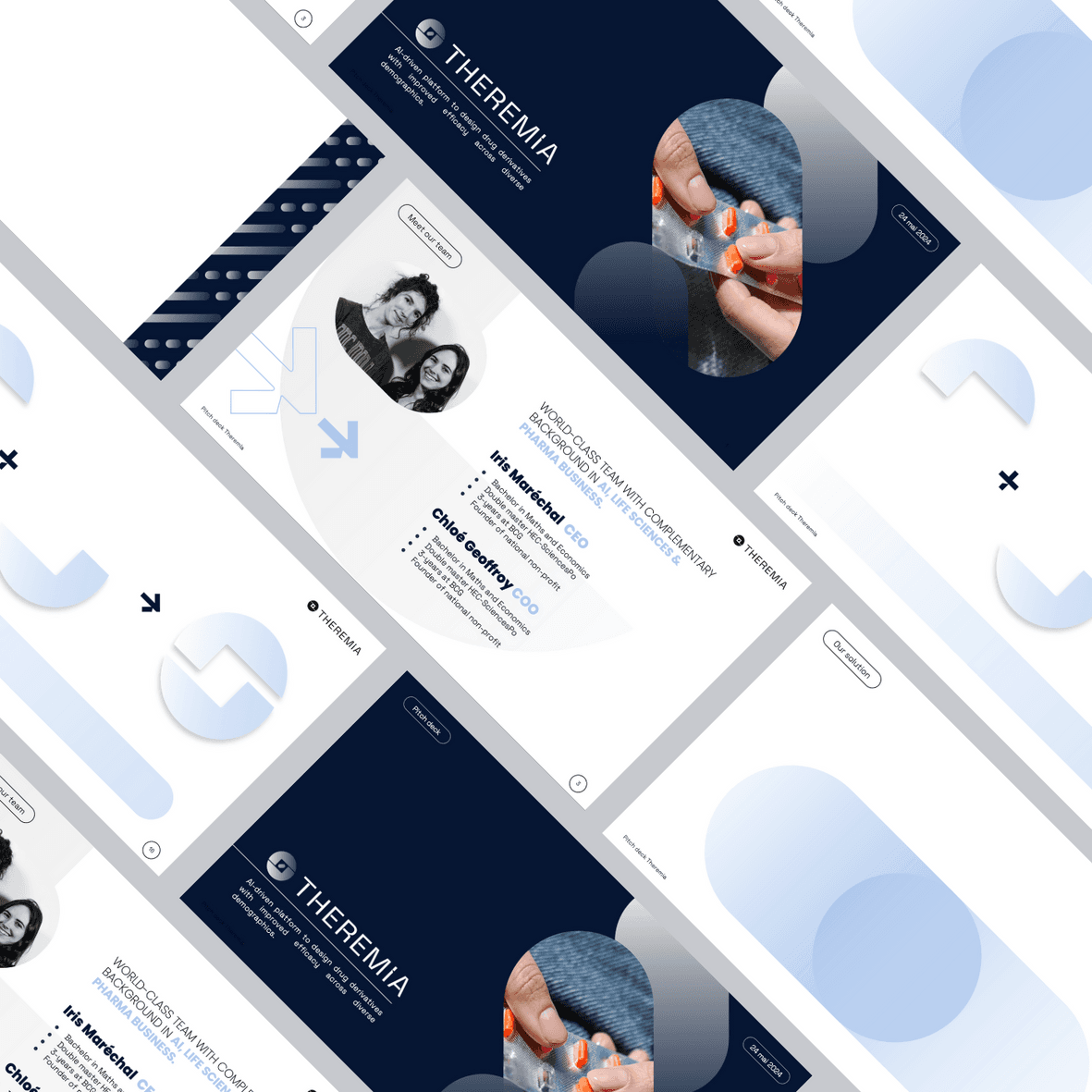 Theremia est un projet singulier monté par deux docteurs en pharmacie : Chloé & Iris. Le duo souhaite optimiser l'impact des médicaments sur tous les segments de population afin de garantir une santé plus efficace pour les patients et pour l'industrie pharmaceutique. Start-up née au sein du réseau Entrepreneur First, Theremia a levée 3 millions d'euros fin 2024. Bureau Dimanche les a accompagné dans la création de leur identité visuelle et la conception de leur pitch deck dans le cadre de leur levée de fonds.